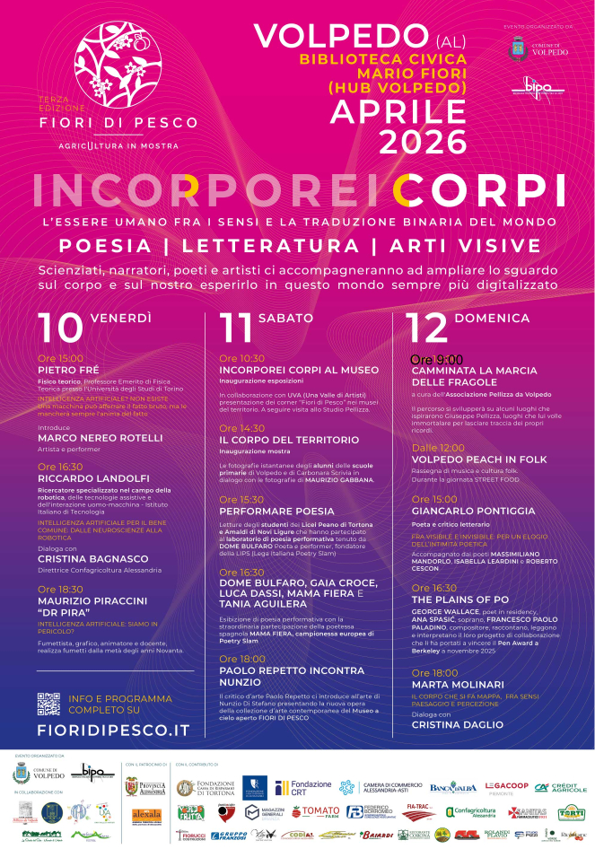 Con il 2026 siamo alla terza edizione, terzo anno di costruzione di un museo a cielo aperto e nuovo argomento di dialogo – Incorporei Corpi: l’essere umano fra i Sensi e la Traduzione Binaria del mondo – Tema essenziale del nostro vivere quotidiano, il rapporto fra la realtà concreta dei sensi (del corpo) e la realtà digitale sempre più condiziona la nostra esperienza del mondo. Il programma, tra letteratura, arte e musica è molto intenso e vario ed è consultabile QUI