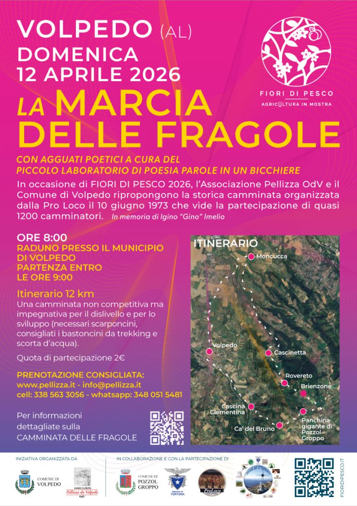 Una camminata si svolgerà nella mattinata di domenica 12 aprile, con ritrovo a partire dalle ore 8.00 davanti al Municipio di Volpedo, con partenza entro le ore 9.00. La riproposizine della ormai storica Marcia delle fragole (prima ed. 1973) vedrà anche quest’anno l’incursione degli “agguati poetici” messi in atto dal laboratorio di poesia “Parole in un bicchiere”, che caratterizzeranno e renderanno unica questa esperienza. A seguire ci sarà la possibilità del ristoro presso i banchi di Street Food che saranno presenti all’Antico Mercato. Nel pomeriggio la rassegna proseguirà con le musiche e le danze dell’Appennino delle quattro province e con i Lou Dalfin, oltre che con gli incontri letterari in programma presso l’”Hub Volpedo”. Non mancate!